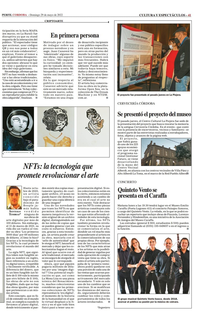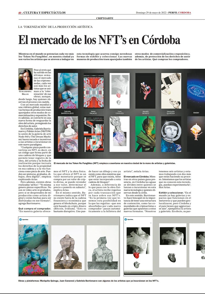 En Córdoba, Gabriela Barrionuevo y Fabián Arias (N&TDM, la unión de la galería de arte Nodo 940 y The Dream Machine) hacen escuela e incentivan a sus artistas a incursionar en este nuevo paradigma. “Cualquier pieza puede convertirse en NFT, es decir, en un código que forma parte de una cadena de bloques y que permite tener registro de la obra, del artista y la fecha de realización porque incrusta los derechos de la propiedad en esa cadena y a la vez funciona como pieza de arte. Pueden ser pinturas, grabados, dibujos, obra digital”, empieza explicando Arias.